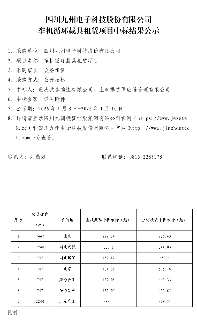 1.采购单位:四川九州电子科技股份有限公司 2.项目名称:车机循环载具租赁项目 3.采购事项:设备租赁 4.采购方式:公开招标 5.中标人:重庆共享物流有限公司、上海携赁供应链管理有限公司 6.中标金额:详见附件 7.公示期:2026年1月8日-2026年1月10日 8. 详情请登录四川九洲投资控股集团有限公司官网(https://www.jezetek.cc)和四川九州电子科技股份有限公司官网(http://www.jiuzhoutech.com.cn)查看。 |