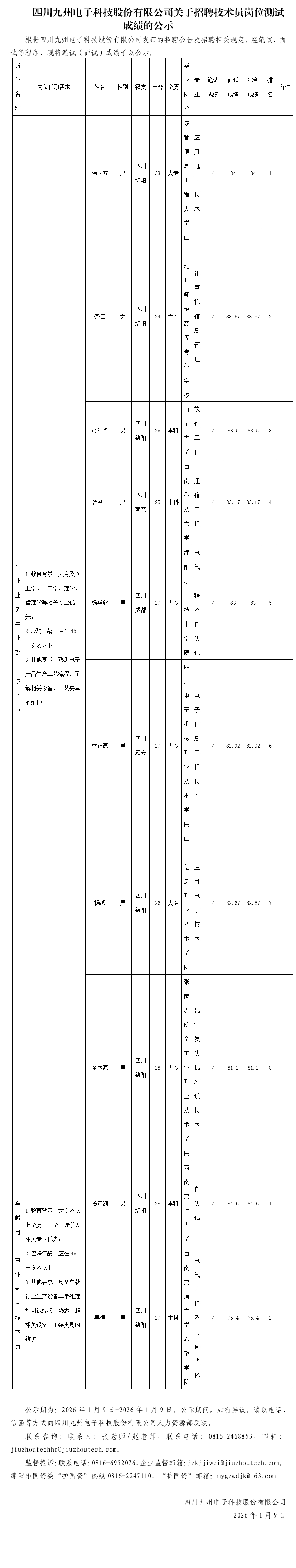 四川九州电子科技股份有限公司关于招聘技术员岗位测试成绩的公示