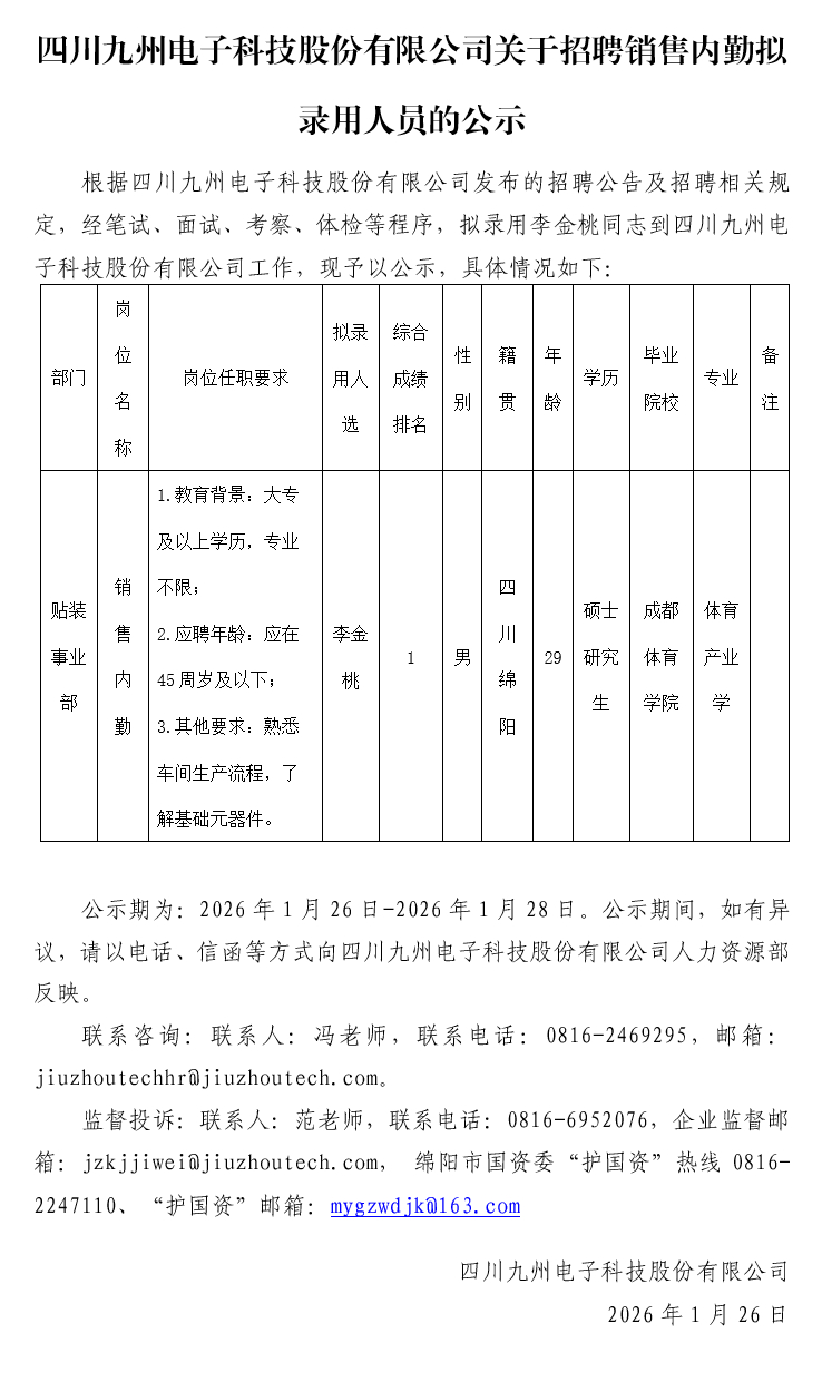 四川九州电子科技股份有限公司关于招聘销售内勤拟录用人员的公示