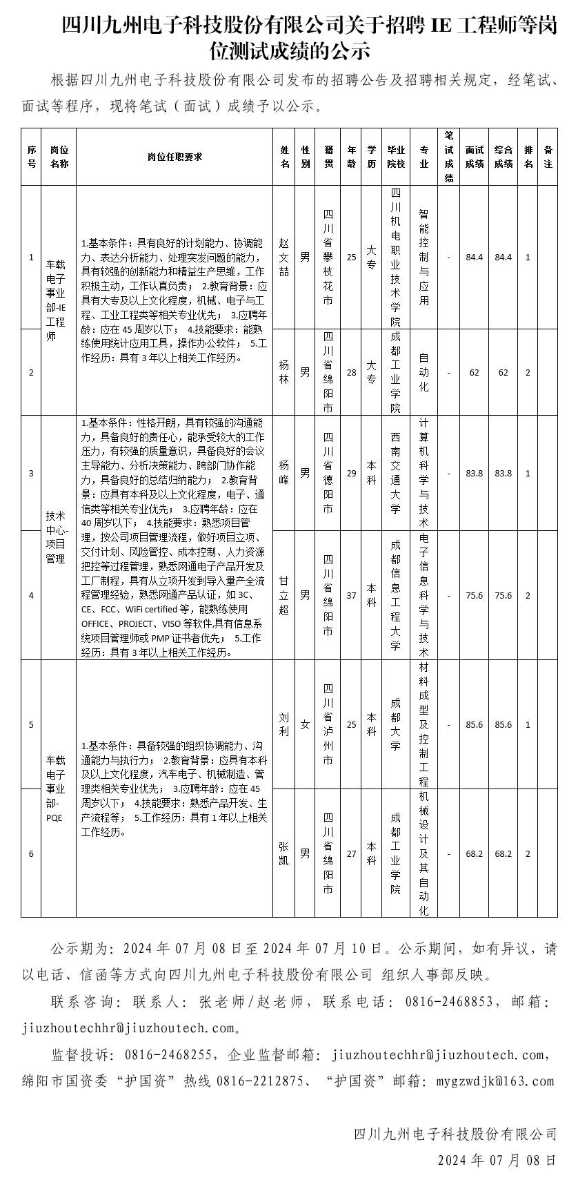 四川九州电子科技股份有限公司关于招聘IE工程师等岗位测试成绩的公示