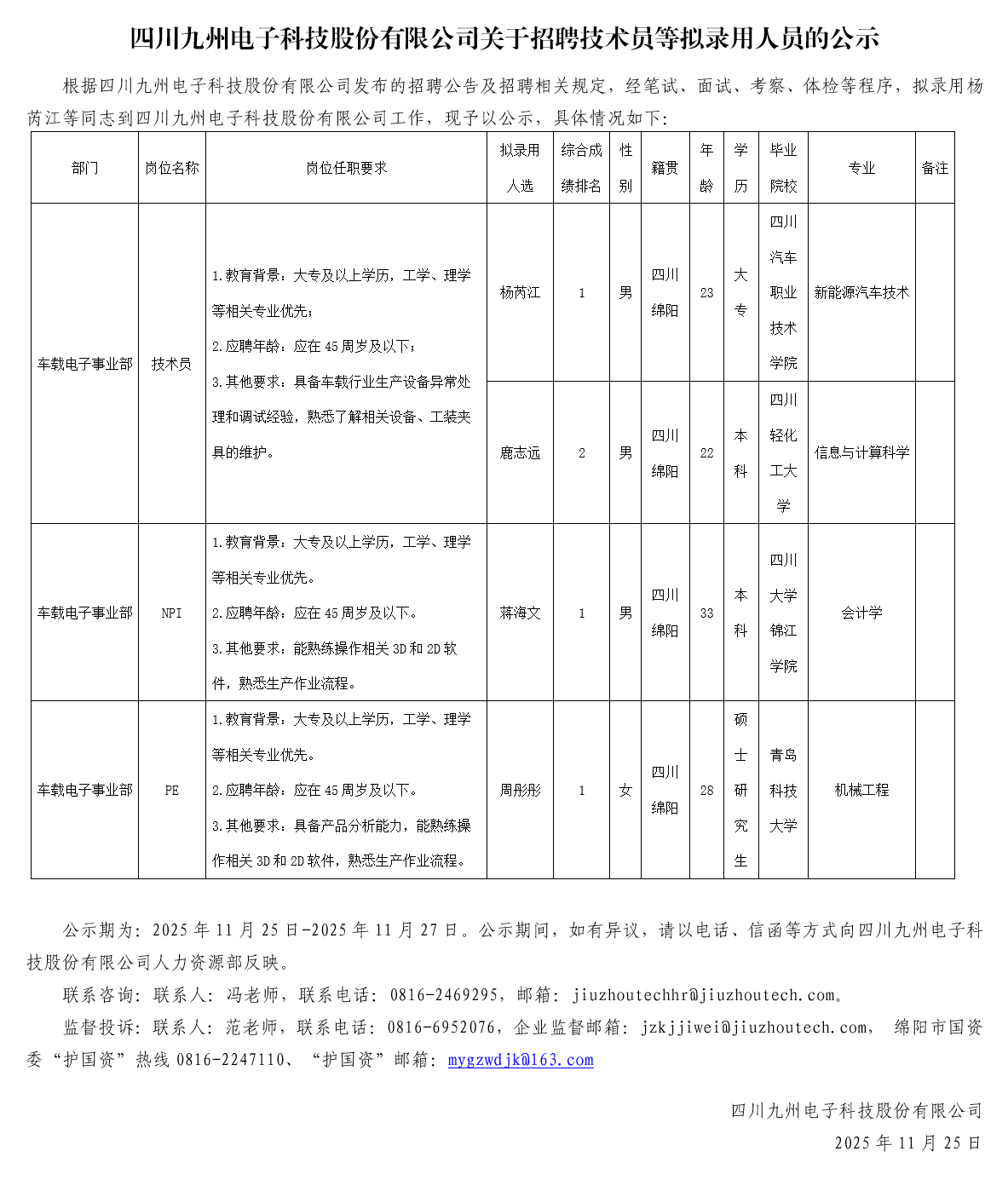 四川九州电子科技股份有限公司关于招聘技术员等拟录用人员的公示