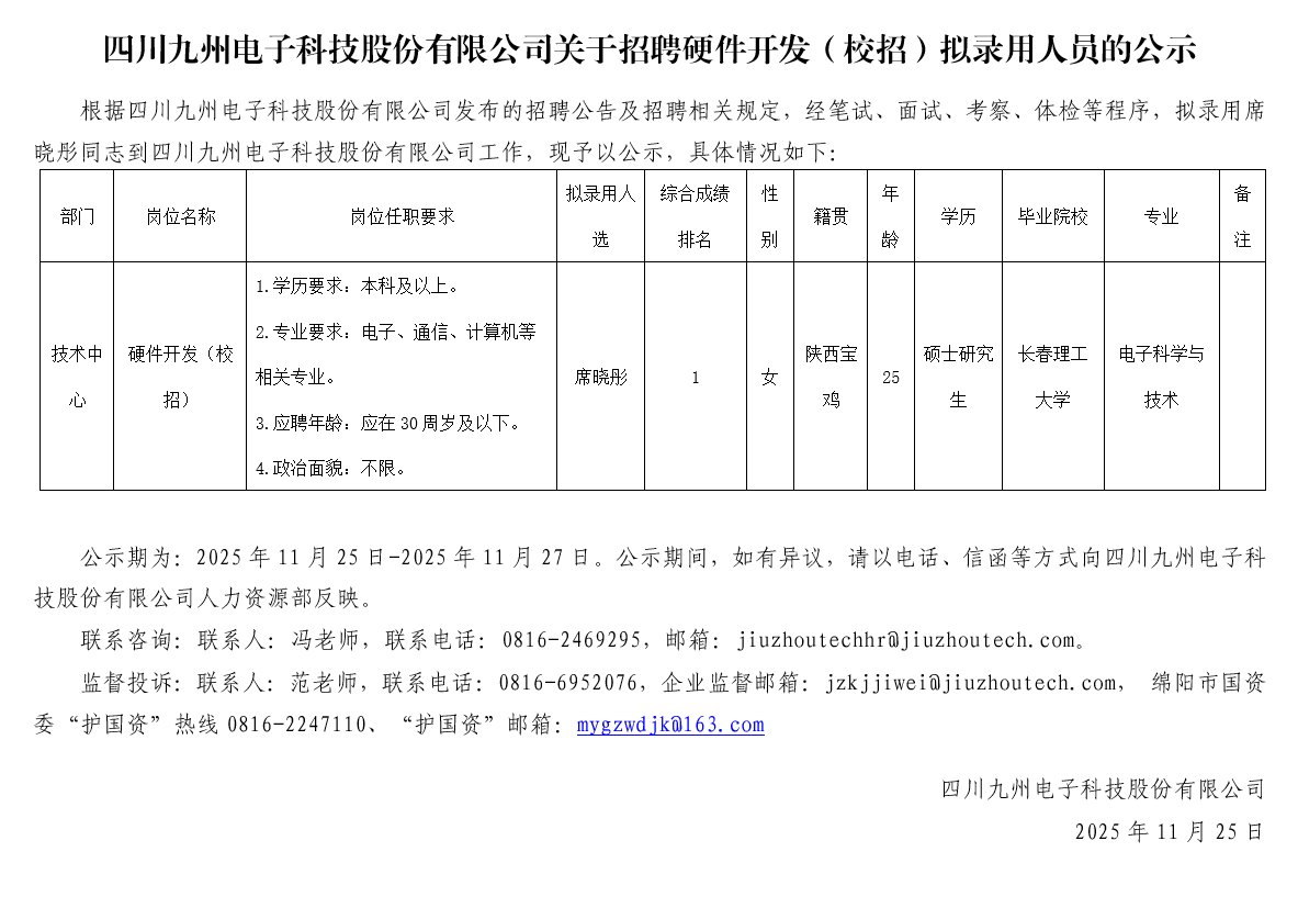 四川九州电子科技股份有限公司关于招聘硬件开发(校招)拟录用人员的公示