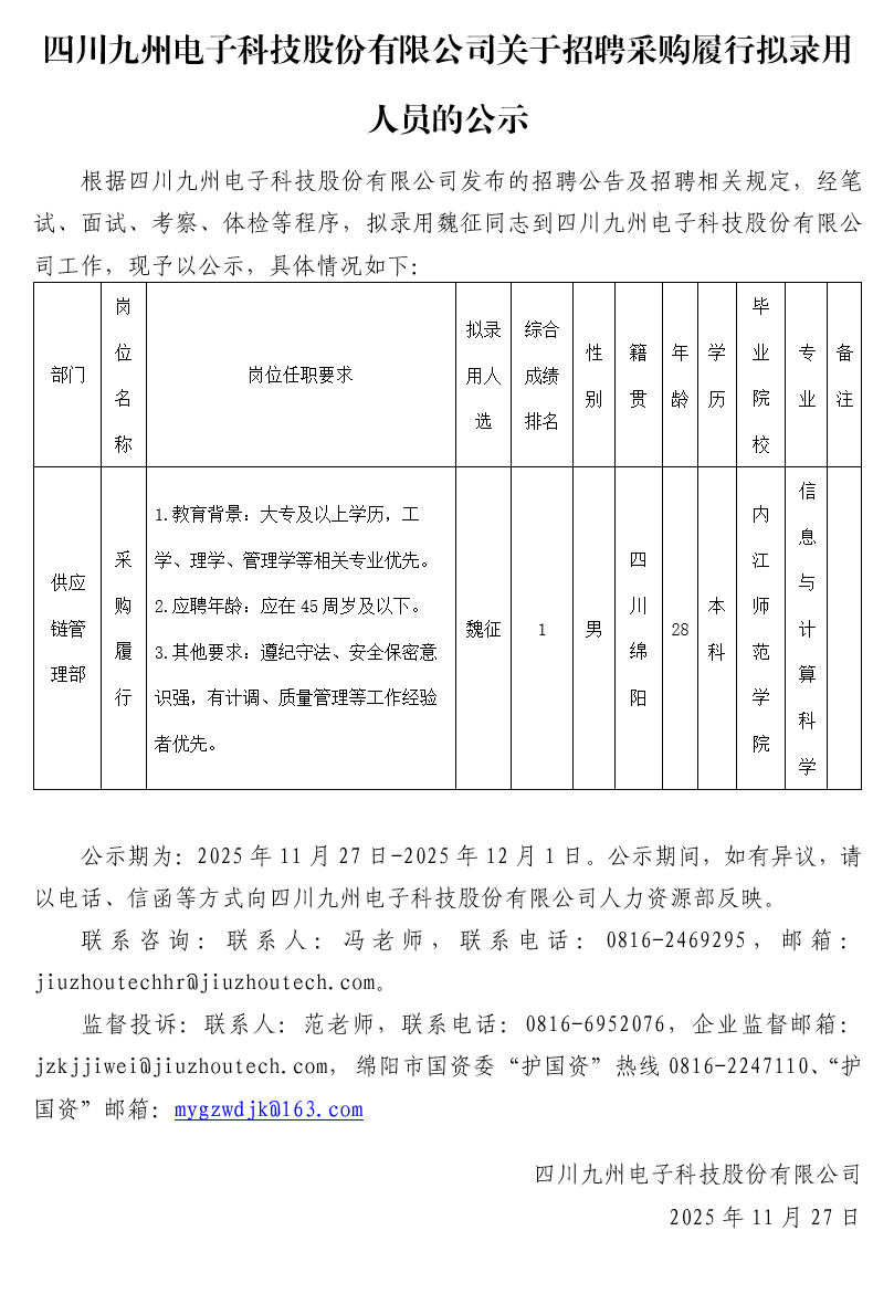 四川九州电子科技股份有限公司关于招聘硬采购履行拟录用人员的公示