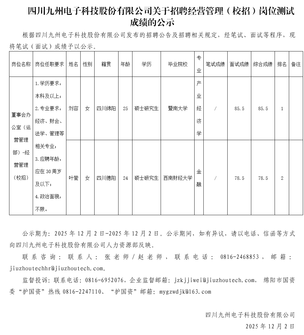 四川九州电子科技股份有限公司关于招聘经营管理(校招)岗位测试成绩的公示