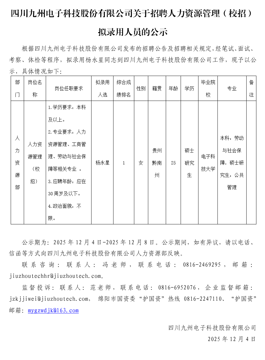 四川九州电子科技股份有限公司关于招聘人力资源管理(校招)拟录用人员的公示