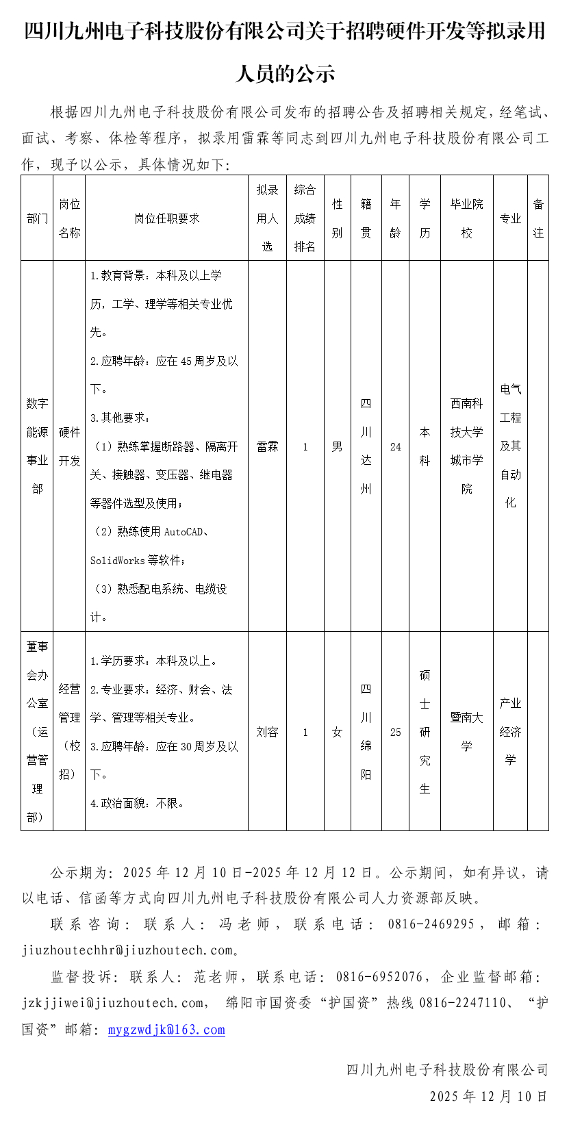 四川九州电子科技股份有限公司关于招聘硬件开发等拟录用人员的公示