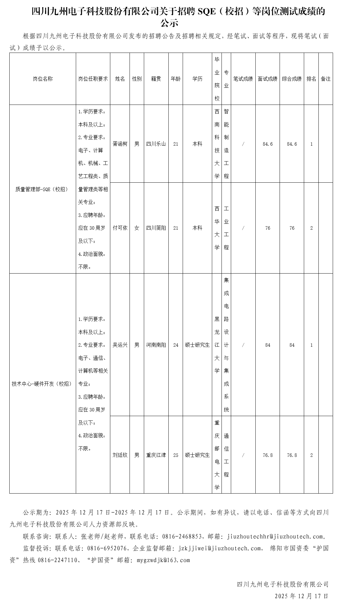 四川九州电子科技股份有限公司关于招聘SQE(校招)等岗位测试成绩的公示