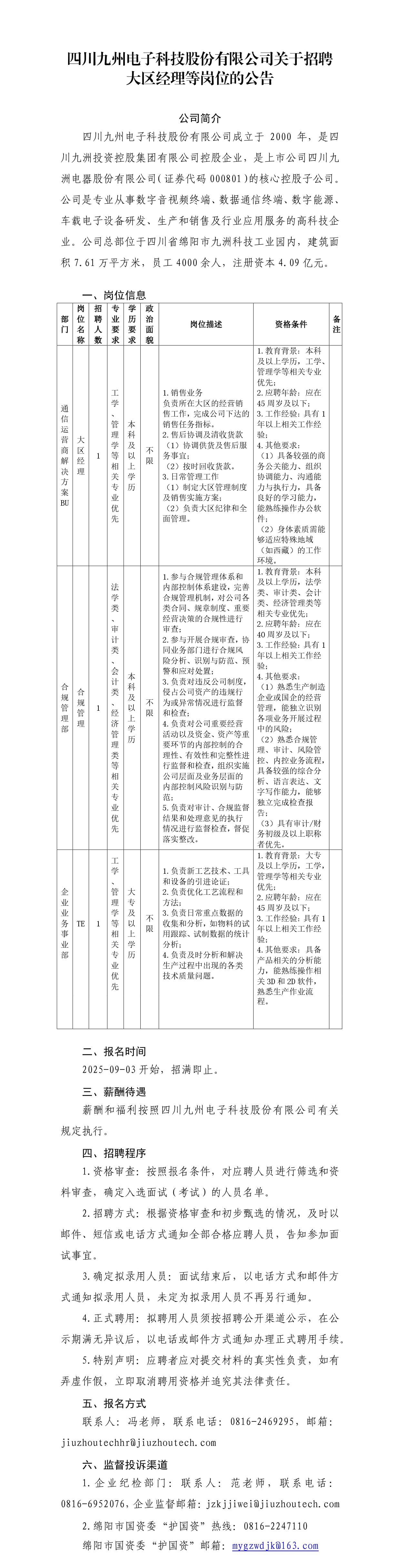 四川九州电子科技股份有限公司关于招聘大区经理等岗位的公告