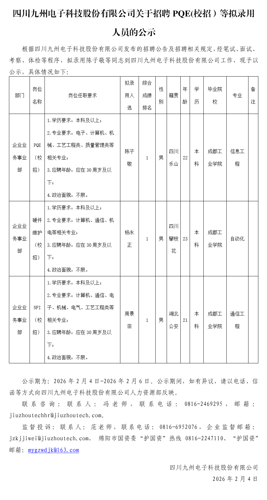 四川九州电子科技股份有限公司关于招聘PQE(校招)等拟录用人员的公示