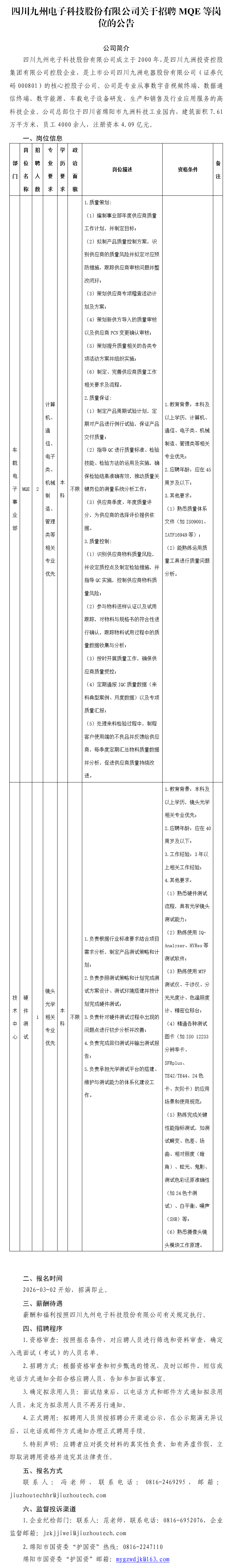 四川九州电子科技股份有限公司关于招聘MQE等岗位的公告