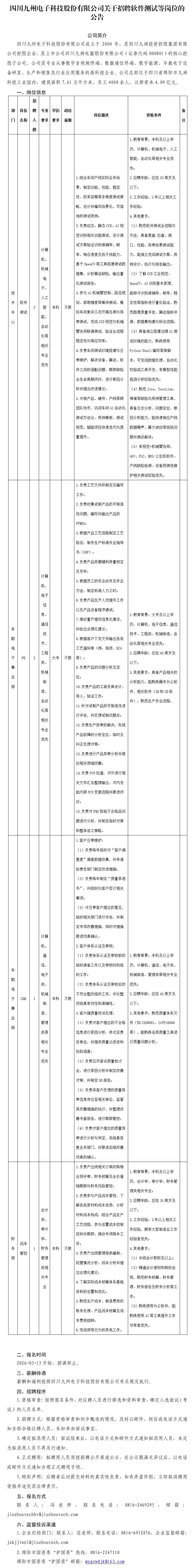 四川九州电子科技股份有限公司关于招聘软件测试等岗位的公告