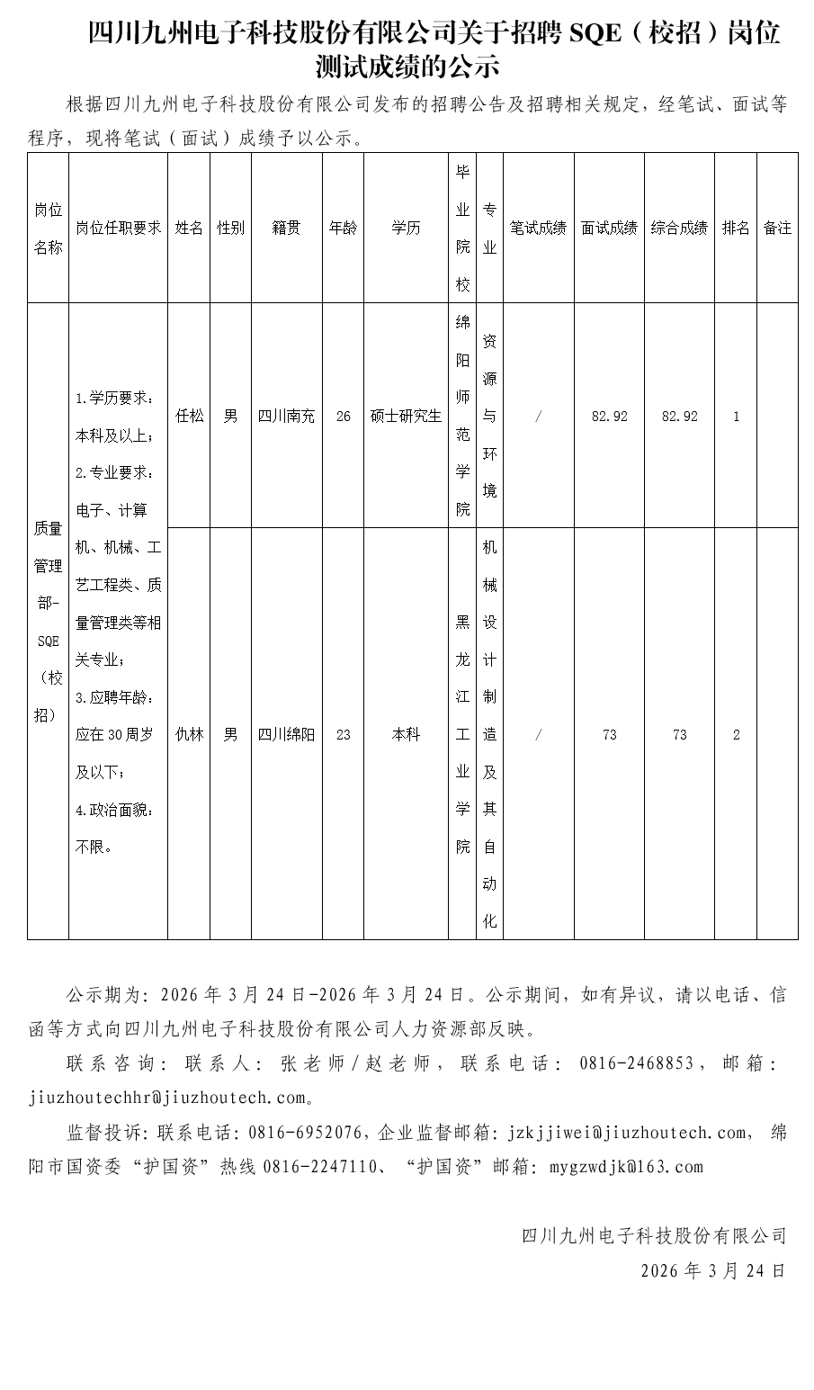 四川九州电子科技股份有限公司关于招聘SQE(校招)岗位测试成绩的公示