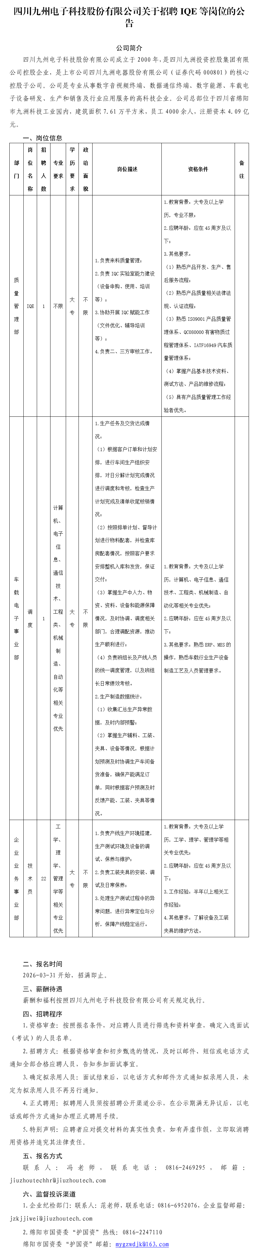 四川九州电子科技股份有限公司关于招聘IQE等岗位的公告