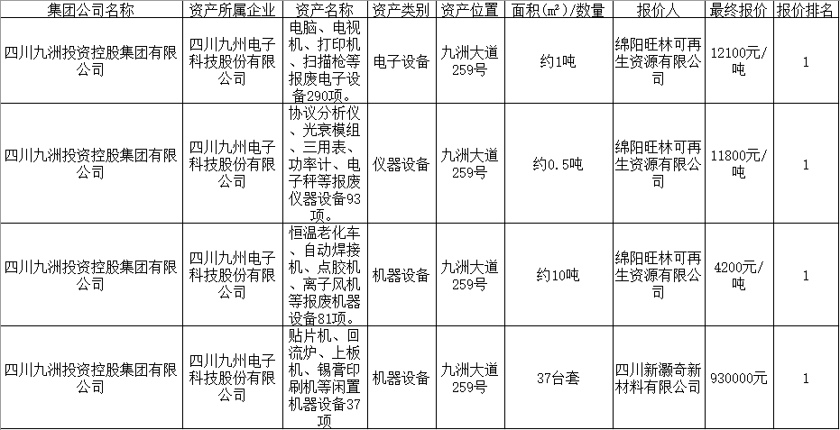 四川九州电子科技股份有限公司资产处置结果