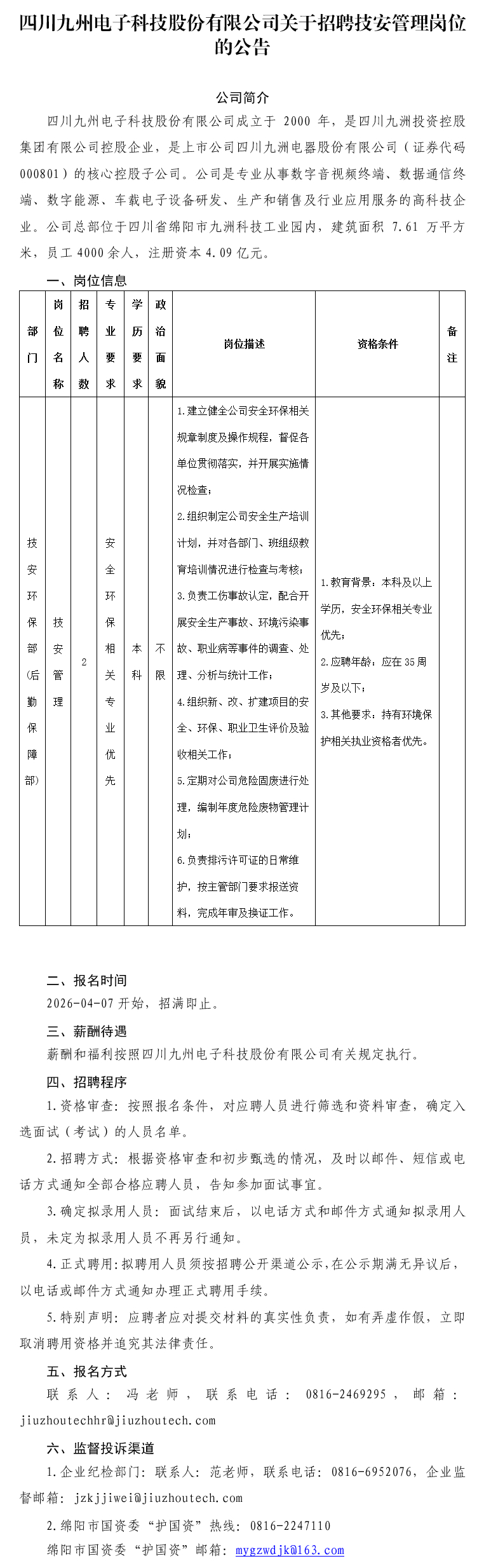 四川九州电子科技股份有限公司关于招聘技安管理岗位的公告