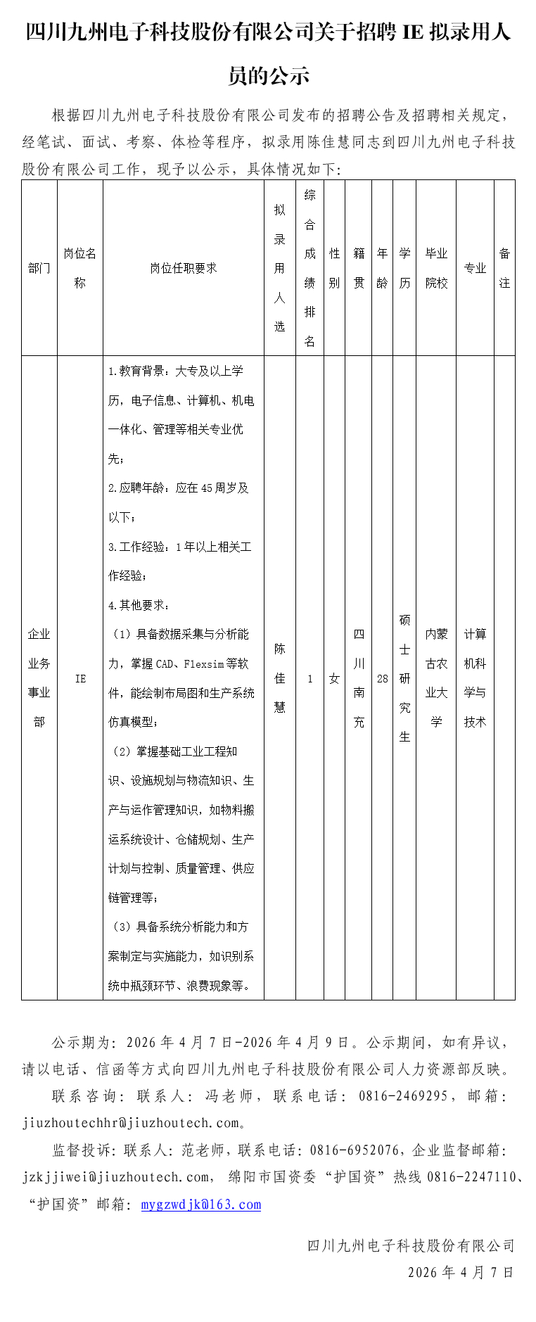 四川九州电子科技股份有限公司关于招聘IE拟录用人员的公示
