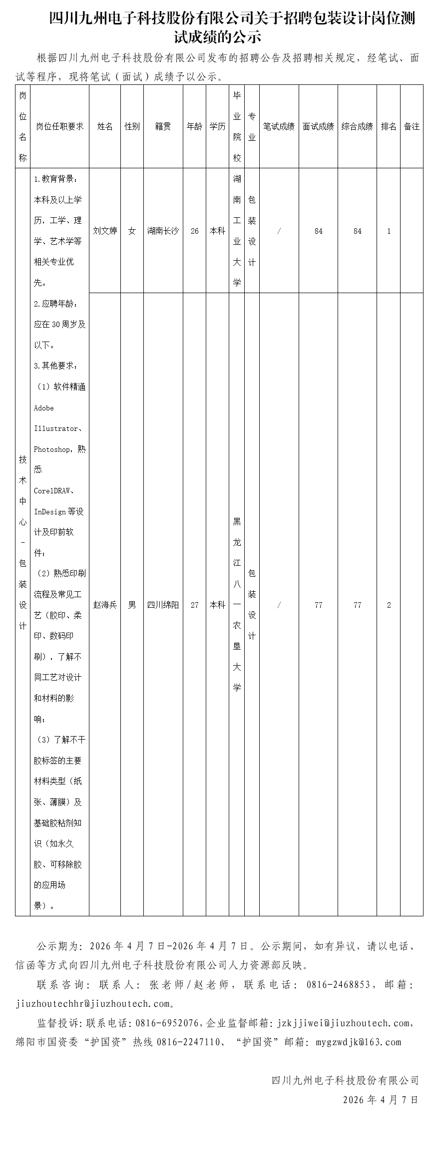四川九州电子科技股份有限公司关于招聘包装设计岗位测试成绩的公示