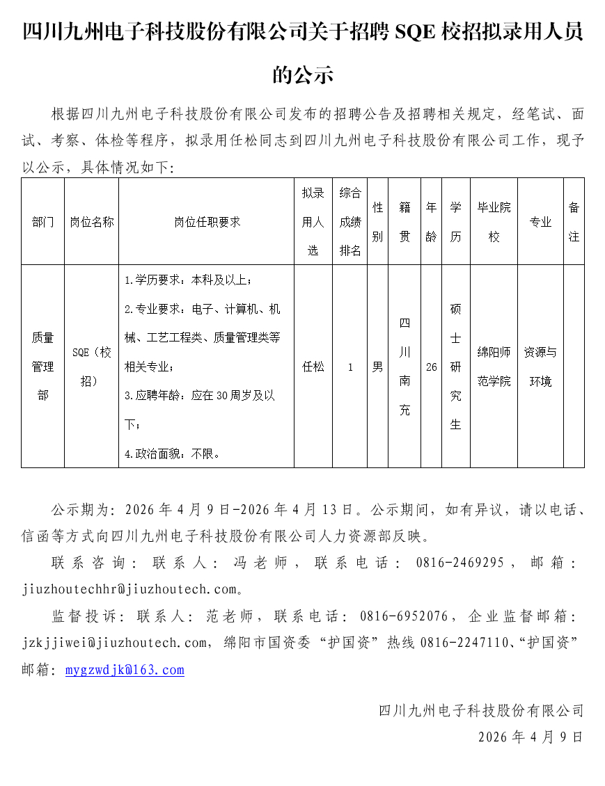 四川九州电子科技股份有限公司关于招聘SQE校招拟录用人员的公示
