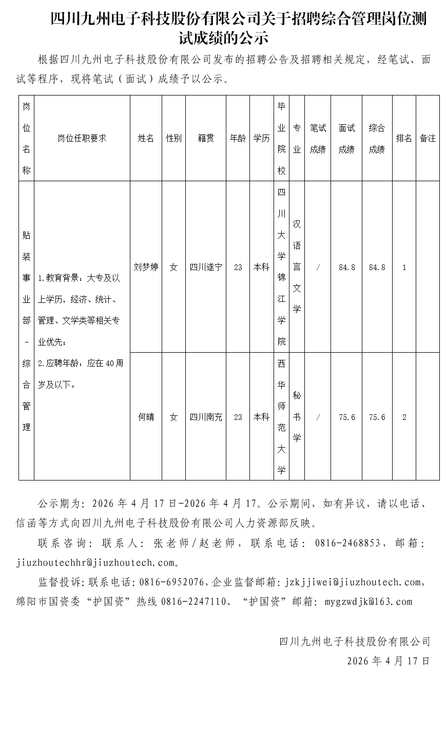 四川九州电子科技股份有限公司关于招聘综合管理岗位测试成绩的公示