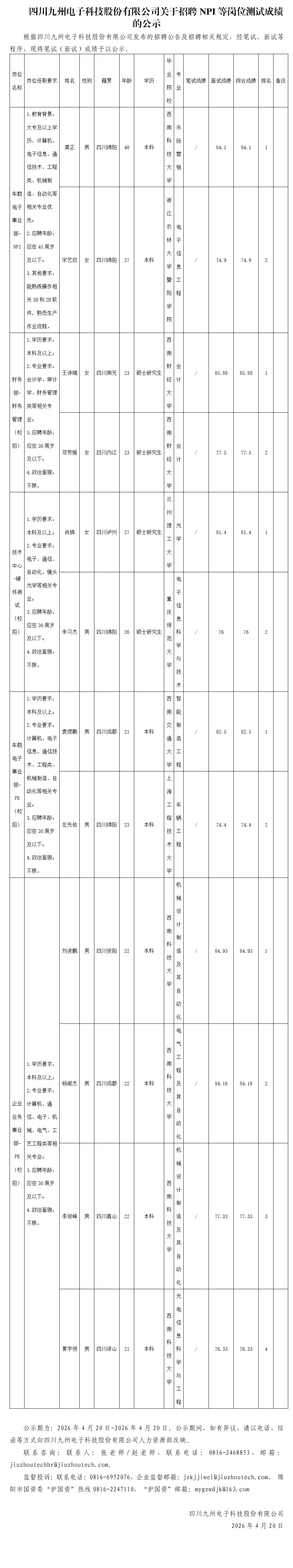 四川九州电子科技股份有限公司关于招聘NPI等岗位测试成绩的公示