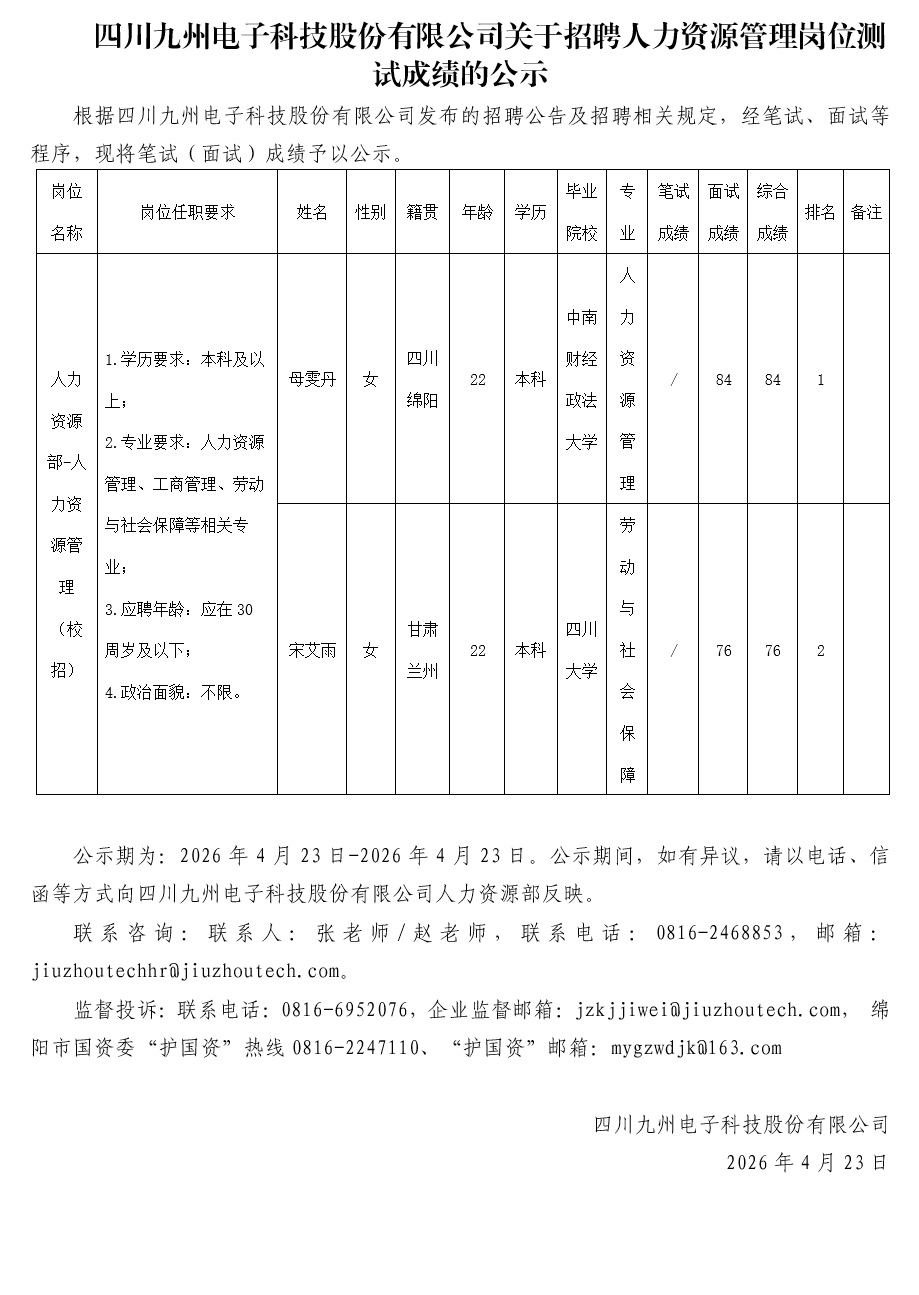 四川九州电子科技股份有限公司关于招聘人力资源管理岗位测试成绩的公示