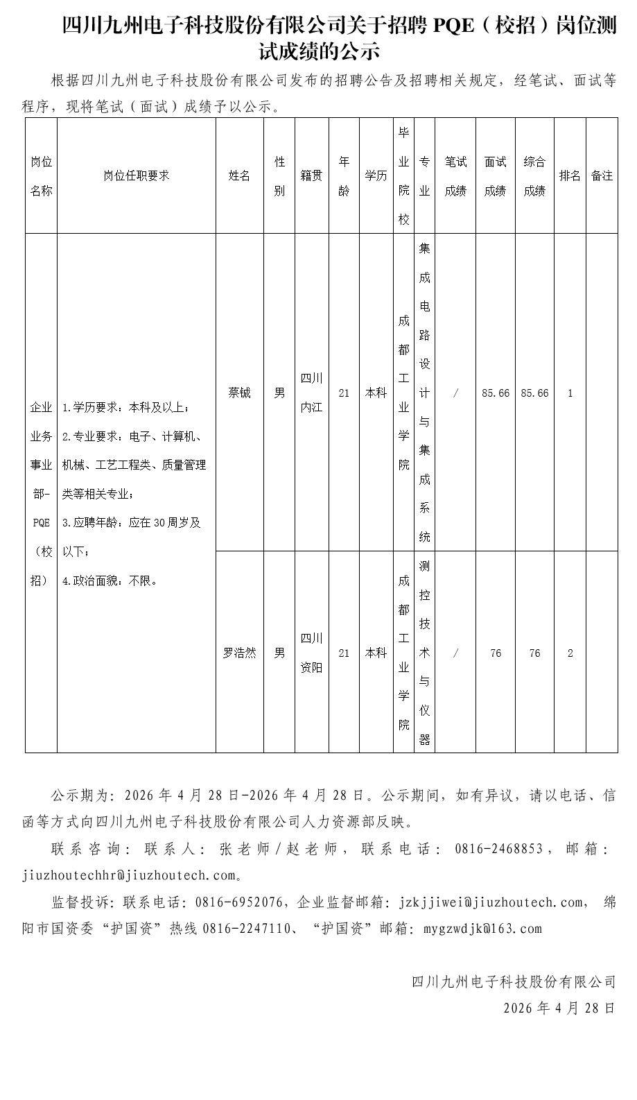 四川九州电子科技股份有限公司关于招聘PQE(校招)岗位测试成绩的公示