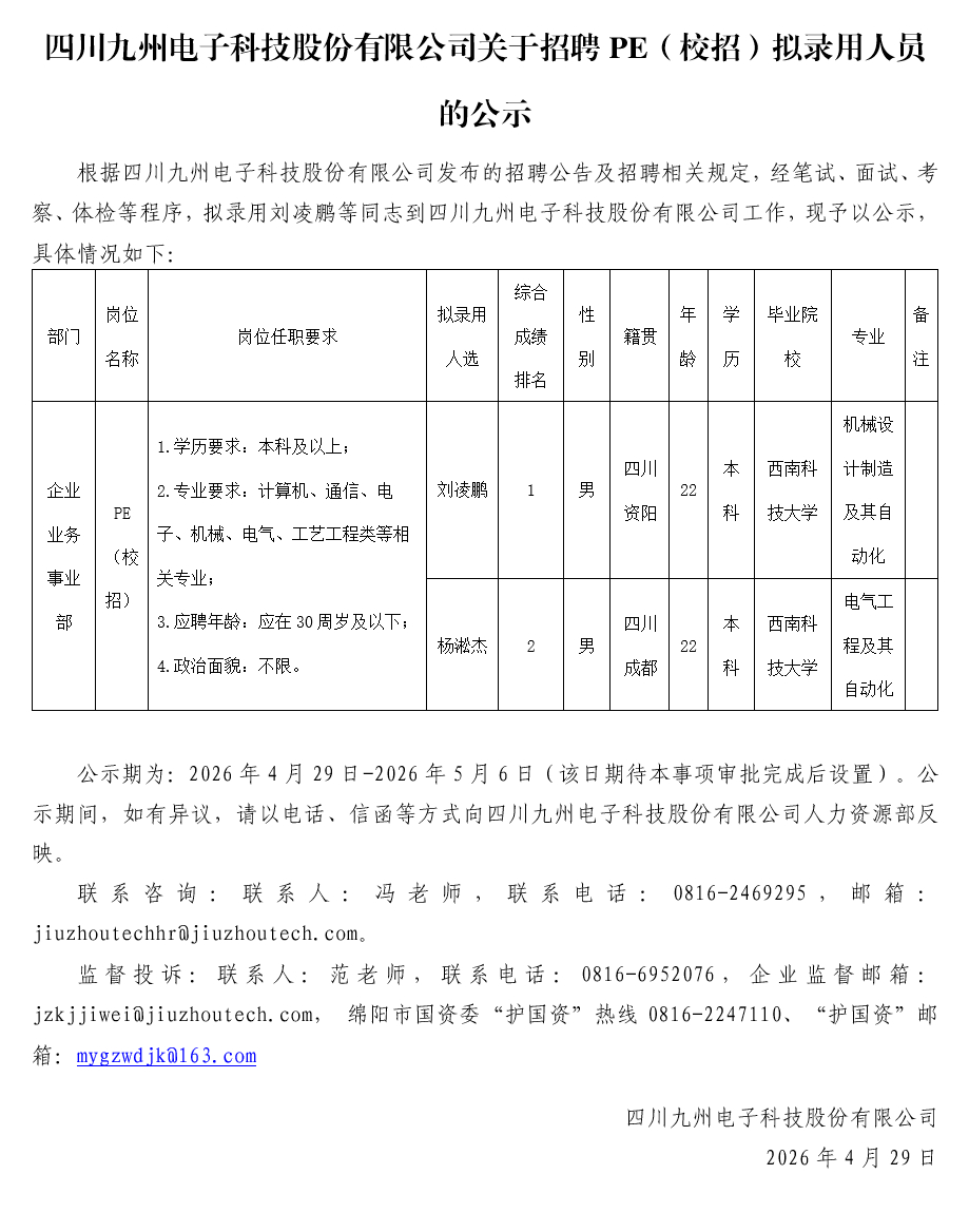 四川九州电子科技股份有限公司关于招聘PE(校招)拟录用人员的公示