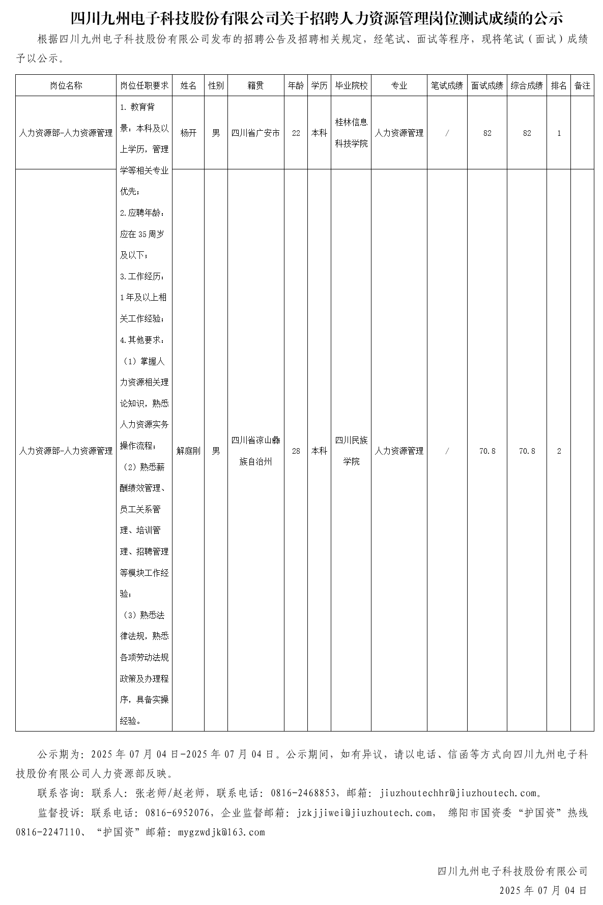 四川九州电子科技股份有限公司关于招聘人力资源管理岗位测试成绩的公示